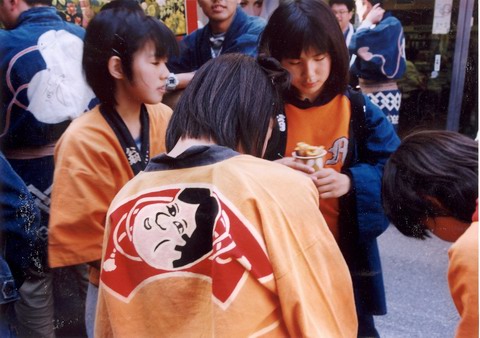 お囃子のボランティアの中学生も 山車の止まった一時の休み、やはり「食い気」が先。